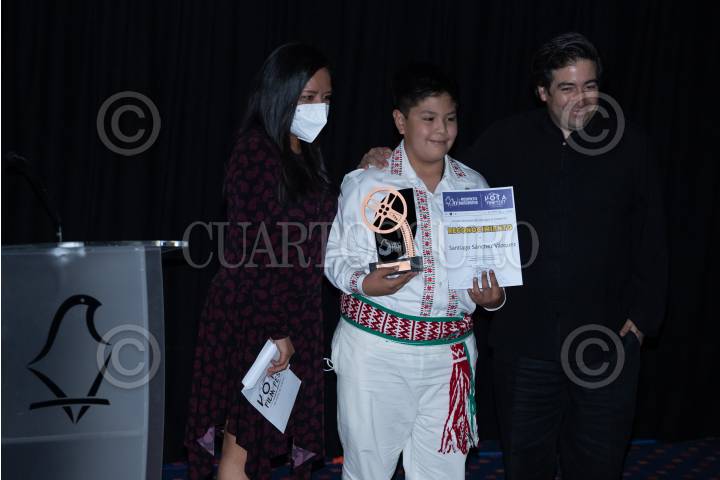 Sonia Pérez, el ganador del 3er lugar Santiago Sánchez Vázquez y Pedro Araneda durante la ceremonia de premiación del concurso Vota Film Fest en su cuarta edición, Tu voto en corto.