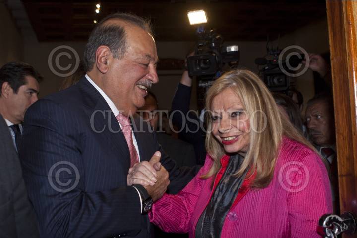 MÉXICO, D.F., 29SEPTIEMBRE2011.- El empresario Carlos Slim y Marie Jo Paz, última esposa del escritor Octavio Paz, durante la ceremonia donde el primero recibió la presa Sor Juana Inés de la Cruz que otorga la Universidad del Claustro de Sor Juana, por los diez años de trabajo que ha realizado al frente del Comité Ejecutivo del Consejo Consultivo para el Rescate del Centro Histórico. En la imagen, a su llegada al recinto educativo. FOTO: ISAAC ESQUIVEL/CUARTOSCURO.COM