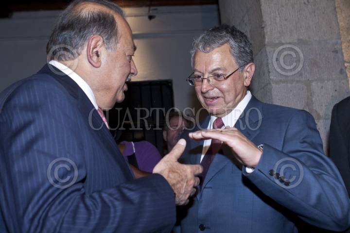 MÉXICO, D.F., 29SEPTIEMBRE2011.- El empresario Carlos Slim y Manuel Camacho Solis, durante la ceremonia donde el primero recibió la presa Sor Juana Inés de la Cruz que otorga la Universidad del Claustro de Sor Juana, por los diez años de trabajo que ha realizado al frente del Comité Ejecutivo del Consejo Consultivo para el Rescate del Centro Histórico. En la imagen, a su llegada al recinto educativo. FOTO: ISAAC ESQUIVEL/CUARTOSCURO.COM