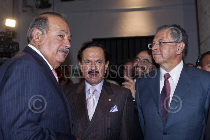 MÉXICO, D.F., 29SEPTIEMBRE2011.- El empresario Carlos Slim, Juan Francisco Ealy, director de El Universal, y Manuel Camacho Solis, durante la ceremonia donde el primero recibió la presa Sor Juana Inés de la Cruz que otorga la Universidad del Claustro de Sor Juana, por los diez años de trabajo que ha realizado al frente del Comité Ejecutivo del Consejo Consultivo para el Rescate del Centro Histórico. En la imagen, a su llegada al recinto educativo. FOTO: ISAAC ESQUIVEL/CUARTOSCURO.COM