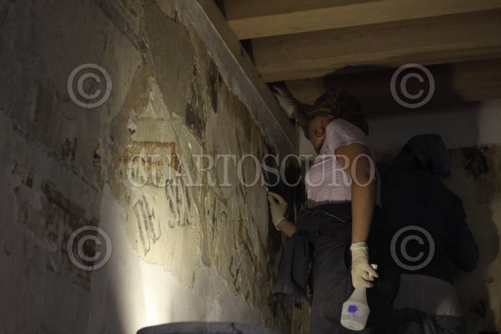 OAXACA, OAXACA, 13AGOSTO2011.- La fundación Alfredo Harp Helú trabaja desde el 2007 en el rescate del Ex Convento del Siglo XVI de Santo Domingo o San Pablo de Soriano o ubicado en pleno Centro Histórico de la ciudad de Oaxaca, para lo cual han adquirido seis de nueve propiedades las cuales forman parte de la estructura del inmueble. Durante los trabajos se detectaron vestigios arqueológicos de Montea Albán 1 aproximadamente de los años 300 o 500 antes de Cristo, así como adaptaciones de la época de la colonia y la revolución. Los empleados han utilizado diversos accesorios como escalpelos con los cuales han ido quitando distintas capas de pintura hasta llegar a las originales. El Ex Convento fue la primera casa de la orden dominica en Oaxaca. Entre los rescates han estado el Claustro, sotocoro, coro y la capilla. Los trabajos registran un avance del 70 por ciento y se espera concluyan para el mes de octubre y así pueda ser admirado por los habitantes de la ciudad de Oaxaca o turistas, informó el encargado de la obra, Sebastían Van Doesburg. FOTO: ARTURO PÉREZ ALFONSO/CUARTOSCURO.COM