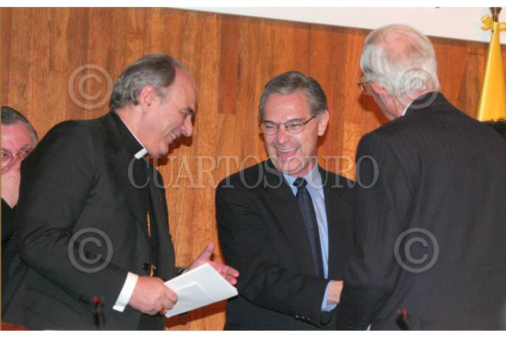MÉXICO, D. F. 05JUNIO2004.- El Mons. Marcelo Sánchez Sorondo y el Secretario de Relaciones Exteriores Luis Ernesto Derbezal termino del coloquio "Globalización y justicia Internacional". FOTO: Iván Stephens/CUARTOSCURO.COM