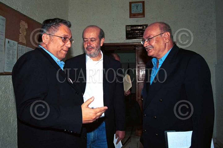 Rodrigo Asturias, candidato para la presidencia en Guatemala por el partido Unión Revolucionaria Guatemalteca, ofreció una conferencia en el auditorio de la sede nacional del PRD. A su salida saludó a Ramón Sosamontes y Mario Saucedo. FOTO: Moisés Pablo/CUARTOSCURO.COM