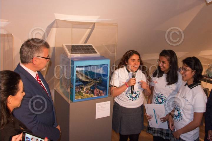 CIUDAD DE MÉXICO, 11FEBRERO2019.- Sergio Patgher, Gerente general de Telcel, Sebastian, escultor, premio nacional Bellas Artes y Jorge Ricksrds, gerente general de WWF México, con las ganadoras del primer lugar del concurso,"Escúchame" en donde participaron 16 mil estudiantes de secundaria y preparatoria, inspirados en la ballena jorobada, esta exposición se mantendrá del 12 al 24 de febrero en el museo Soumaya. FOTO: ROGELIO MORALES /CUARTOSCURO.COM
