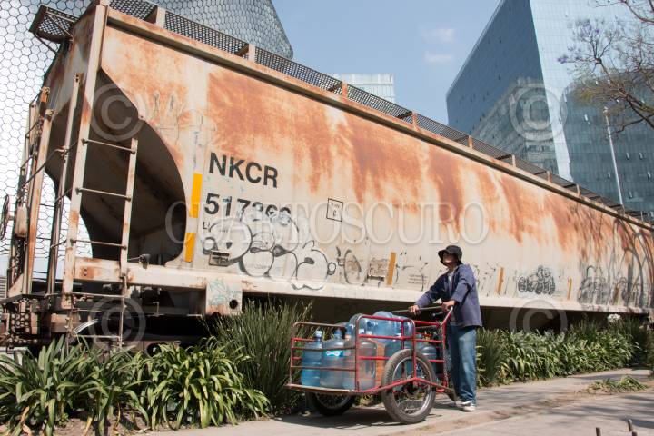 CIUDAD DE MÉXICO, 11FEBRERO2019.-Repartidor de agua, espera el cruce del tren ubicado en avenida Ferrocarril de Cuernavaca esquina con Prolongación Moliere en la colonia Granada, de la alcaldía Miguel Hidalgo, frente al museo Soumaya. FOTO: ROGELIO MORALES /CUARTOSCURO.COM