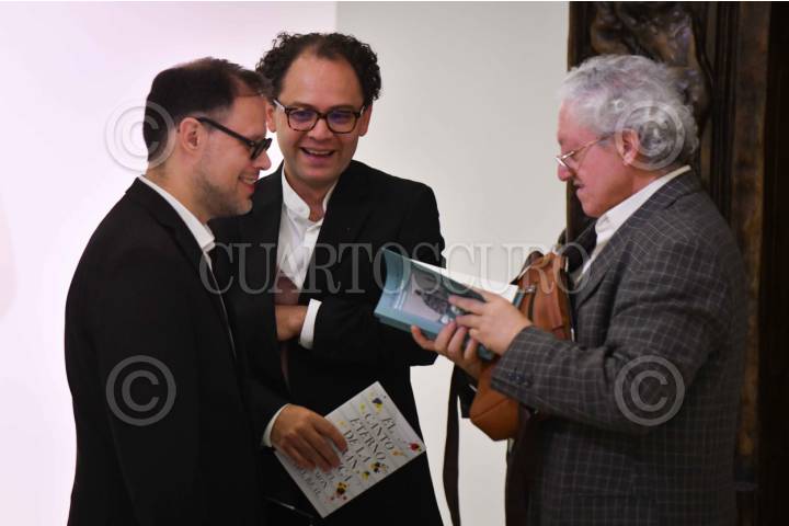 CIUDAD DE MÉXICO, 03FEBRERO2024.- Miguel Salmon del Real, director de la Orquesta Sinfónica Sinaloa de las Artes y escritor; José Manuel Recillas, poeta y ensayista, y Alfonso Miranda, director general de Museo Soumaya, durante la presentación del libro "El canto eterno de la gran música" realizada en el lobby del Museo Soumaya. FOTO: MARIO JASSO/CUARTOSCURO.COM