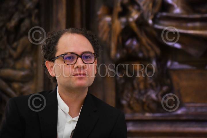 CIUDAD DE MÉXICO, 03FEBRERO2024.- Alfonso Miranda, director general de Museo Soumaya, durante la presentación del libro "El canto eterno de la gran música" de Miguel Salmon del Real, director de la Orquesta Sinfónica Sinaloa de las Artes y escritor, realizada en el lobby del Museo Soumaya. FOTO: MARIO JASSO/CUARTOSCURO.COM