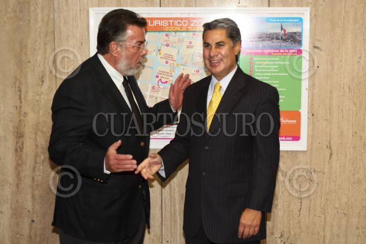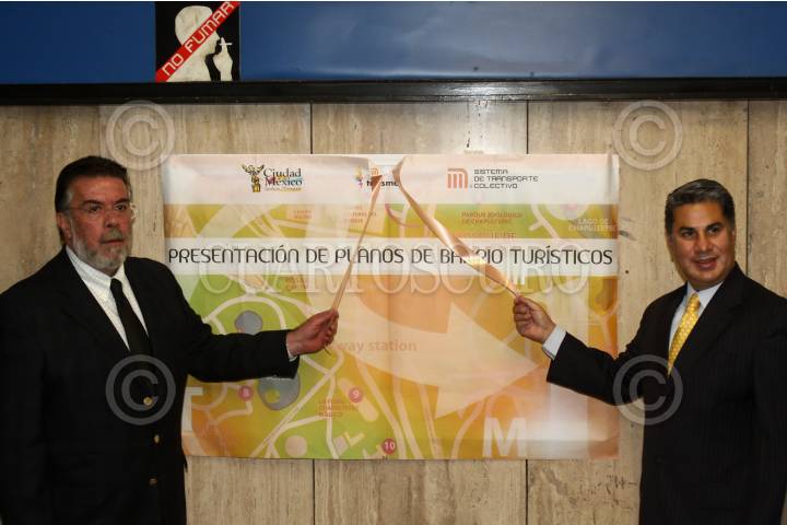 MÉXICO, D.F., 13ENERO2011.- Francisco de Souza, director de medios del Metro y Alejandro Rojas Díaz Durán, secretario de Turismo del Distrito Federal durante la presentación de mapas turísticos en el Sistema de Transporte Colectivo Metro en la que turistas y visitantes nacionales y extranjeros podrán consultar 54 mapas turísticos que se colocaron en 14 diferentes estaciones con el objetivo de guiar a los usuarios a los sitios turísticos cercanos a las estaciones. FOTO: RODOLFO ANGULO/CUARTOSCURO.COM