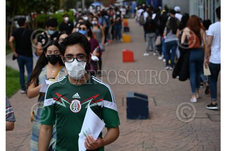 Jóvenes esperan pasar al hospital para poder ser vacunados.