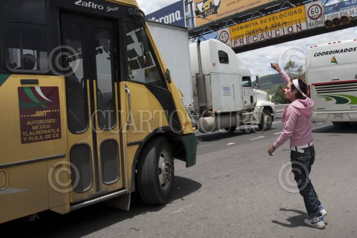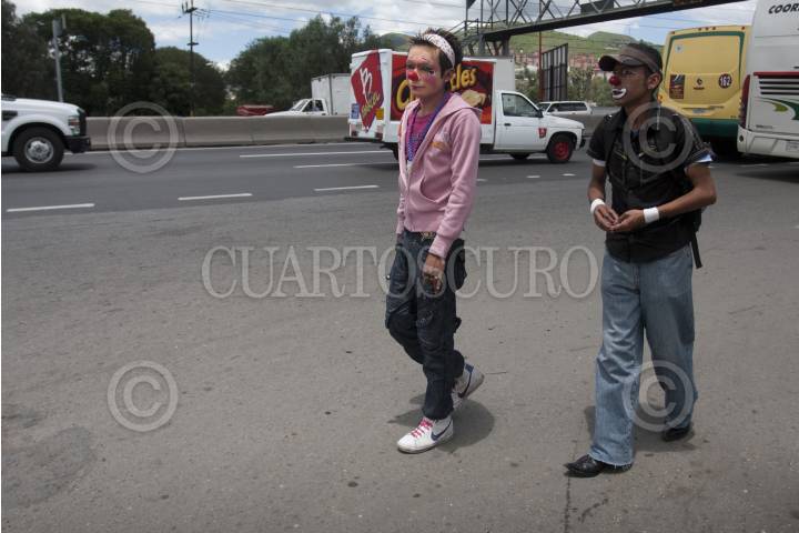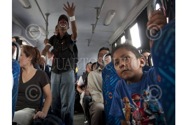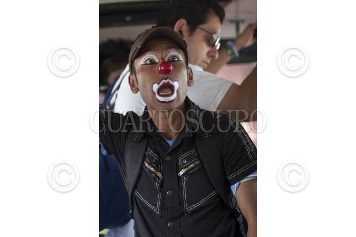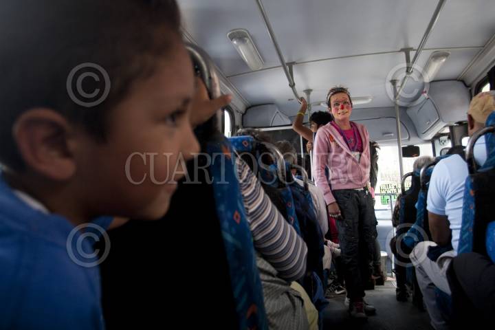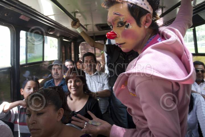 ATIZAPÁN, DE ZARAGOZA., 02AGOSTO2011.- Dulcecito Star y Payasito Frankie, son un par de jóvenes que buscan ganar un poco más, dando pequeños shows en los camiones con jornadas de hasta 12 horas al día, ya que lo que ganan en eventos particulares no les alcanza para los gastos que genera un hogar. FOTO: GUILLERMO PEREA/CUARTOSCURO.COM
