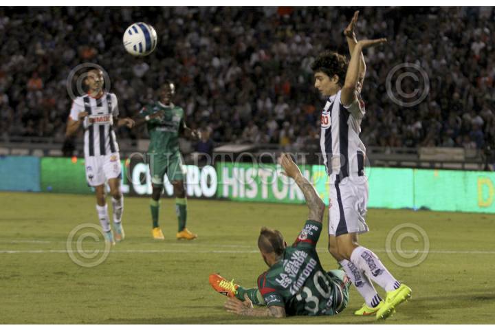 John Stefan Medina Ramírez (Monterrey) disputa un balón con Eduardo Salvio (Pumas, durante el encuentro que empataron a un gol, en el Estadio Olímpico Universitario.