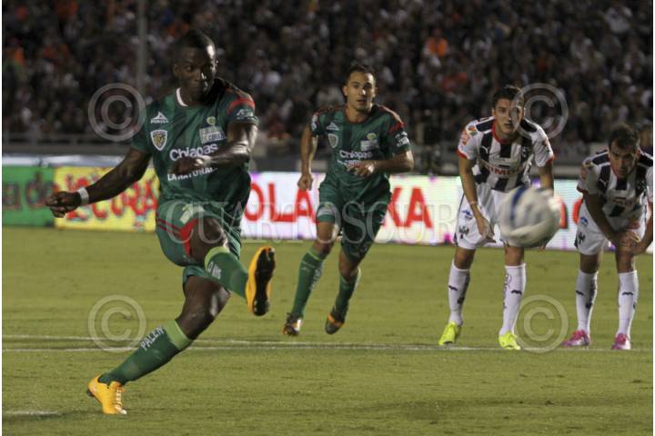 MONTERREY, NUEVO LEÓN, 08NOVIEMBRE2014.- Stefan Medina del equipo de los Rayados del Monterrey se disputa el balón contra Franco Arizala del equipo de Jaguares de Chiapas, en el estadio Tecnológico, partido correspondiente a la jornada 16 de la Liga MX, Apertura 2014 FOTO: GABRIELA PEREZ MONTIEL / CUARTOSCURO.COM