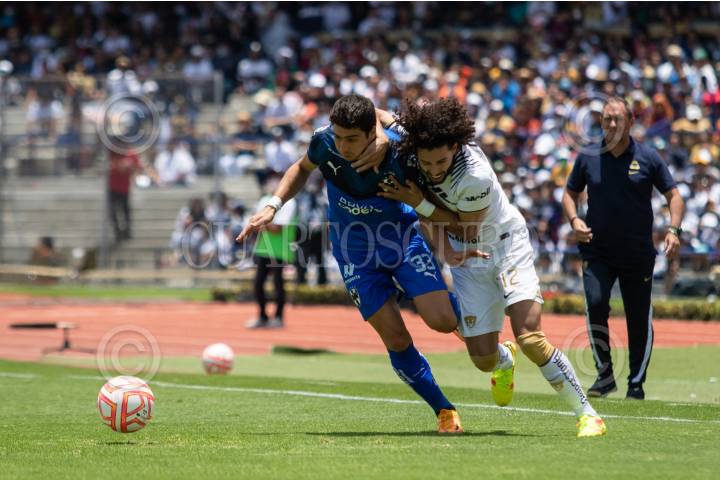 John Stefan Medina Ramírez (Monterrey) disputa un balón con César Huerta (Pumas), durante el encuentro en el Estadio Olímpico Universitario.