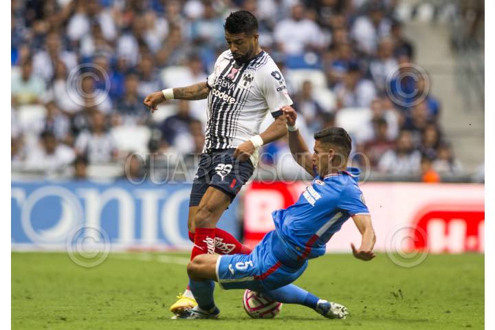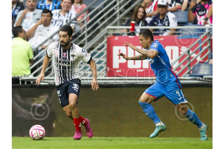 Rodolfo Pizarro de los Rayados del Monterrey se disputa el balón con Julio César Domínguez del Cruz Azul, en el BBVA, partido correspondiente a la vuelta en cuartos de final de la apertura 2022.