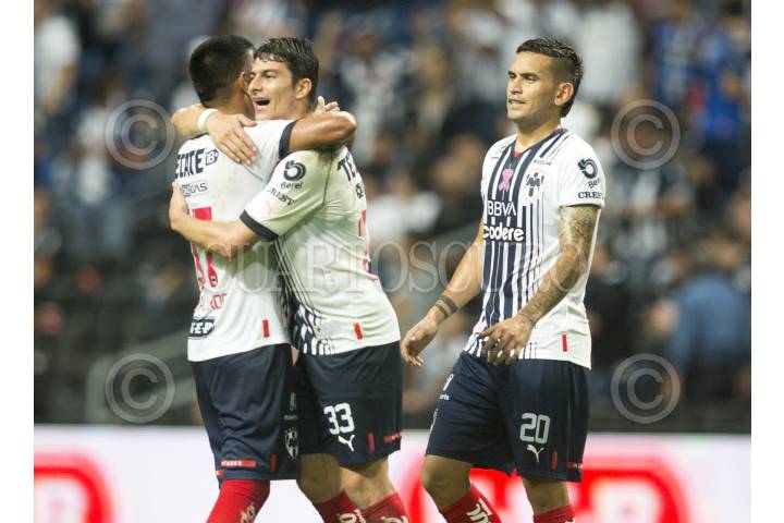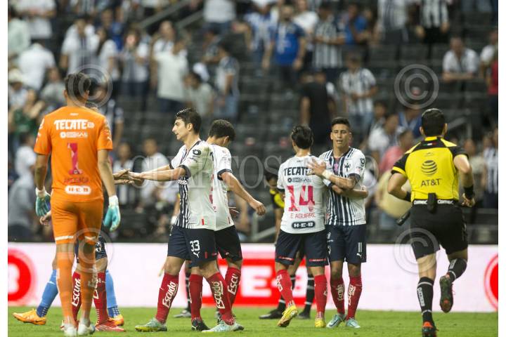 Jugadores de los Rayados del Monterrey celebran el pase a semifinales ante el Cruz Azul, en el estadio BBVA, partido correspondiente a la vuelta en cuartos de final de la apertura 2022.