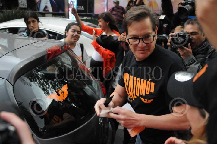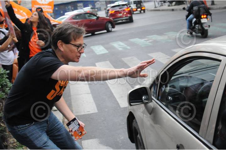CIUDAD DE MÉXICO, 04DICIEMBRE2023. - Salomón Chertorivski, candidato de MC a la jefatura de gobierno, pega un sticker en el auto de una persona que transitaban por Paseo de la Reforma. FOTO: DANIEL AUGUSTO /CUARTOSCURO.COM