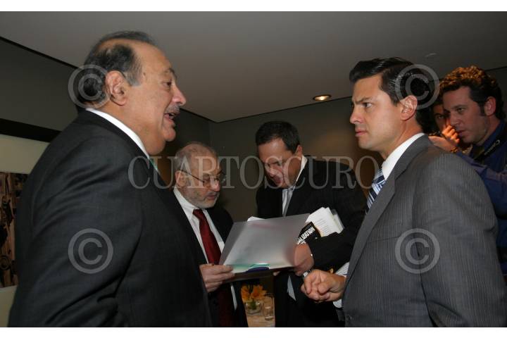 MEXICO, D.F. 09MARZO2006.- Carlos Slim, presidente honorario vitalicio del Grupo Carso, en compañía de Enrique Peña Nieto, gobernador institucional del Estado de México y Joseph Stiglitz, premio nobel de economía durante el Foro para la "Competitividad del país" en el Hotel Sheraton Centro Històrico. FOTO: Rocío Ortiz/CUARTOSCURO.COM