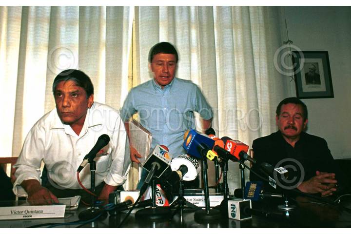 Alberto Gómez, Victor Suárez, José Narro y Max Correa, dirigentes de diversas organizaciones que conforman el movimiento "El campo no aguanta más", en conferencia de prensa anunciaron diversas manifestaciones para los próximos días para demandar la moratoria al capítulo agropecuario del TLCAN; en ellas se preveén ayunos, tomas de aeropuertos, carreteras y casetas de forma pacífica en toda la República, además de algunas marchas en esta ciudad capital. FOTO: Juan Pablo Zamora/CUARTOSCURO.COM