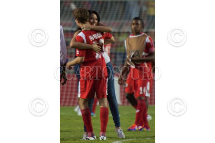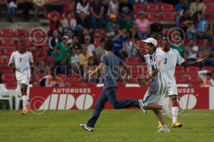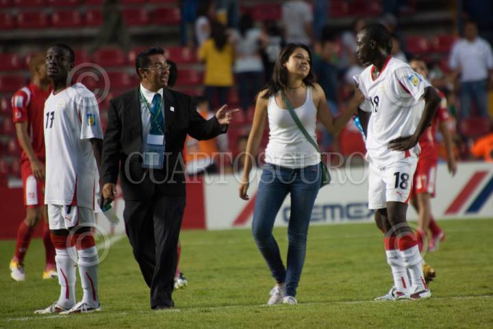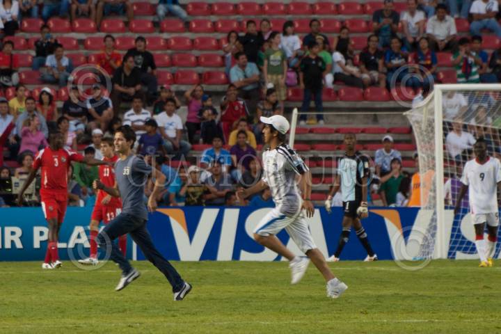 QUERÉTARO, QUERÉTARO, 20JUNIO2011.- Una mujer de manera espontánea ingresó a la cancha para abrazar a los jugadores al final del partido correspondiente al grupo E de la 14a Copa Mundial de Futbol Sub-17, celebrado en el Estadio Corregidora, con un marcador final de Burkina Faso-0, Panama 1. Con anotación por Panamá de Jorman Aguilar. FOTO: DEMIAN CHÁVEZ/CUARTOSCURO.COM