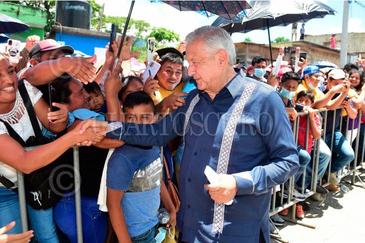 Andrés Manuel López Obrador, Presidente de México, saluda a la gente al finalizar la ceremonia de inauguración del Banco del Bienestar en Villa Corzo.