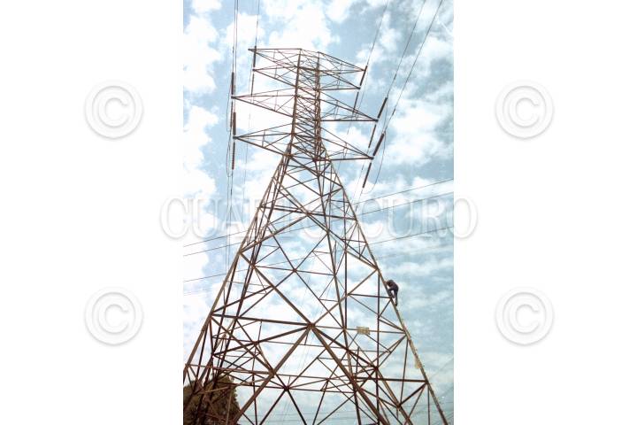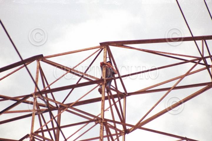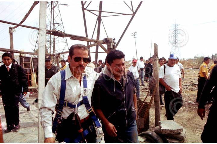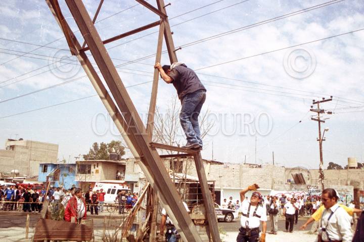 NEZAHUALCÓYOTL, EDO. MEX. 20MAYO2005.- El ex bracero Guadalupe Sánchez Eusebio, se subió a una torre de alta tensión ubicada sobre el Bordo Xochiaca y la calle Cariño de este municipio, con la intención de arrojarse, ya que fue defraudado por una de sus sobrinas por más de 50 mil dólares. FOTO: Oscar López/CUARTOSCURO.COM
