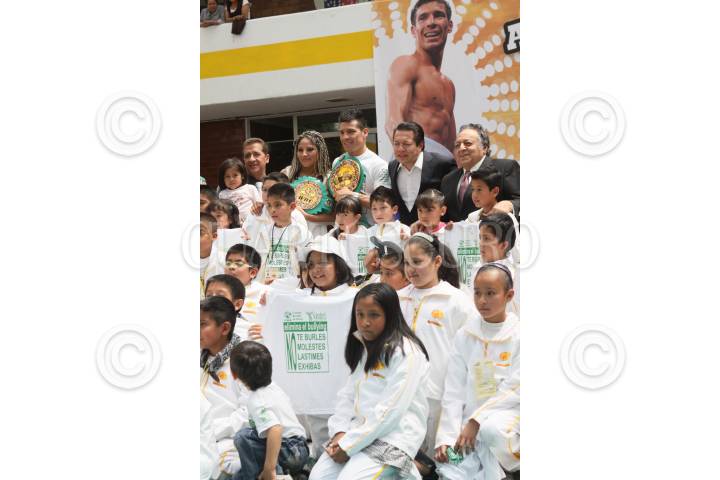 MÉXICO, D.F., 18MARZO2011.- Mariana "La Barbie" Juárez, boxeadora, Sergio "Maravilla" Martínez, boxeador, Mario Delgado, Secretario de Educación y José Sulaimán, presidente del Consejo Mundial de Boxeo, encabezaron el inicio del "Taller Infantil contra la Violencia en Escuelas", ubicado en el DIF República Española . FOTO: MOISÉS PABLO/CUARTOSCURO.COM