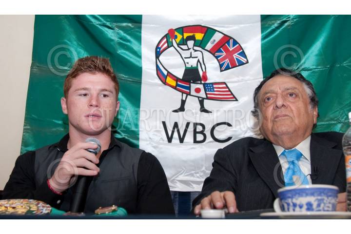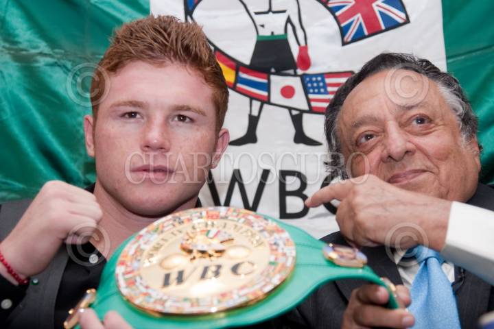 MÉXICO, D.F., 26ABRIL2011.- Saúl 'Canelo' Álvarez, boxeador mexicano y José Sulaimán, presidente del Consejo Mundial de Boxeo (CMB), durante una conferencia de prensa donde se anunció el estreno del Canelo de su título súperwelter del Consejo Mundial de Boxeo (CMB) contra el inglés Ryan Rhodes, el 18 de junio en la Arena 'Vicente Fernandez' de Tlajomulco, Jalisco, México. FOTO: MISAEL VALTIERRA/CUARTOSCURO.COM