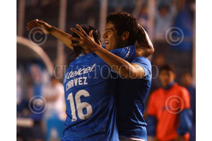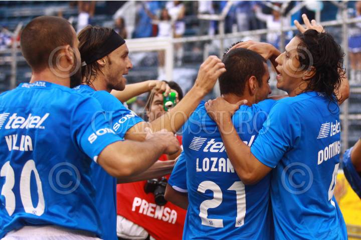 MÉXICO, D.F., 05SEPTIEMBRE2009.- Jugadores del Cruz Azul festejaron la anotación de Gabino Velasco, durante el primer tiempo con lo que la máquina cementera suma ya su segundo triunfo consecutivo en el Torneo Apertura 2009 al doblegar 2-0 a los Indios de Ciudad Juárez. FOTO: SÁSHENKA GUTIERREZ/CUARTOSCURO.COM