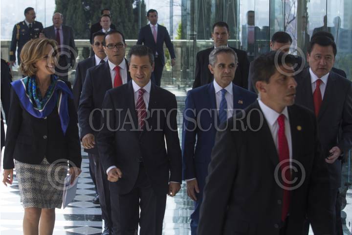 MÉXICO, D.F., 15OCTUBRE2013.- Miguel Ángel Mancera, Jefe de Gobierno Capitalino junto a María Elena Morera, Presidenta Nacional de México Unido contra la Delincuencia; Enrique Peña Nieto, Presidente de la República y Miguel Ángel Osorio Chong, Secretario de Gobernación durante el “Segundo Foro Nacional Sumemos Causas, por la Seguridad + Policías” que tuvo lugar en el Castillo de Chapultepec. FOTO: ENRIQUE ORDÓÑEZ /CUARTOSCURO.COM