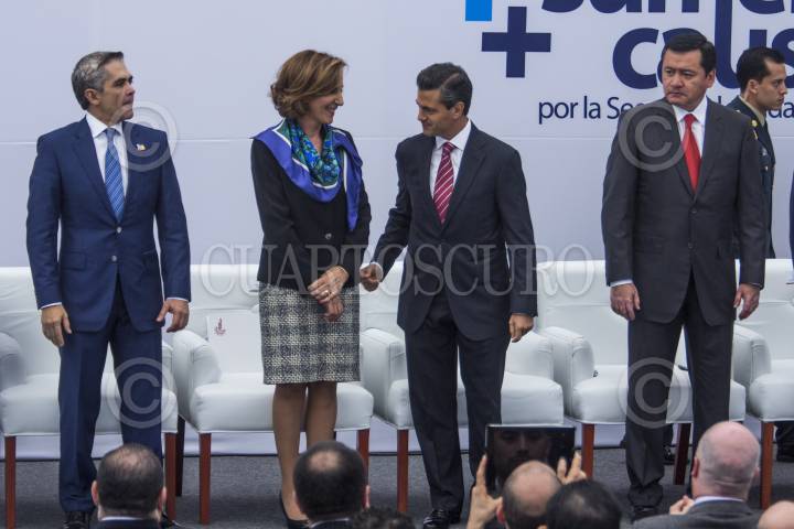 MÉXICO, D.F., 15OCTUBRE2013.- Manuel Mondragón y Kalb, Comisionado de Seguridad Pública junto a Miguel Ángel Mancera, Jefe de Gobierno Capitalino; María Elena Morera, Presidenta Nacional de México Unido contra la Delincuencia; Enrique Peña Nieto, Presidente de la República y Miguel Ángel Osorio Chong, Secretario de Gobernación durante el “Segundo Foro Nacional Sumemos Causas, por la Seguridad + Policías” que tuvo lugar en el Castillo de Chapultepec. FOTO: ENRIQUE ORDÓÑEZ /CUARTOSCURO.COM