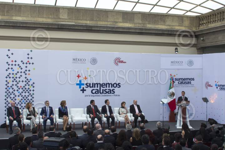 MÉXICO, D.F., 25SEPTIEMBRE2014.- Maria Elena Morera, presidenta de Causa en Común, Enrique Peña Nieto, presidente de México, Miguel Ángel Osorio Chong, secretario de Gobernación, y Roy Campos, durante el Foro Nacional Sumemos Causas por la Seguridad, Ciudadanos + Policías, que realizó la organización Causa en Común. FOTO: ISAAC ESQUIVEL /CUARTOSCURO.COM
