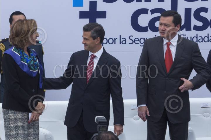 MÉXICO, D.F., 25SEPTIEMBRE2014.- Maria Elena Morera, presidenta de Causa en Común, Enrique Peña Nieto, presidente de México, y Miguel Ángel Osorio Chong, secretario de Gobernación, durante el Foro Nacional Sumemos Causas por la Seguridad, Ciudadanos + Policías, que realizó la organización Causa en Común. FOTO: ISAAC ESQUIVEL /CUARTOSCURO.COM