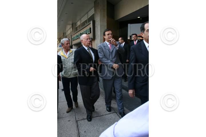 MÉXICO, D.F., 21OCTUBRE2008.- Marcelo Ebrard Jefe de Gobierno aconpañado por José Narro rector de la UNAM a la salida de un hotel sobre avenida reforma en donde le jefe de Gobierno Inauguro esta mañana el Primer Foro Internacional de Educación Media Superior y Superior. FOTO: SÁSHENKA GUTIÉRREZ/CUARTOSCURO.COM