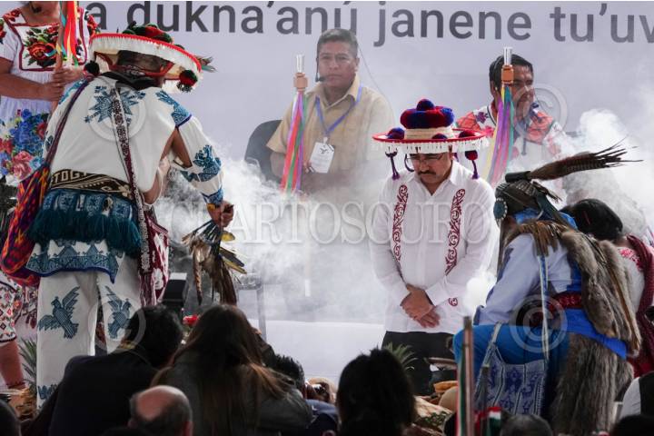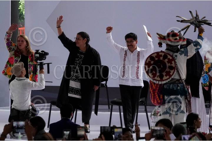 CIUDAD DE MÉXICO, 01SEPTIEMBRE2025.- Sergio Gutiérrez Luna, presidente de la Cámara de Diputados; la presidenta Claudia Sheinbaum Pardo, y Laura Itzel Castillo, presidenta del Senado de la República, acompañaron al magistrado presidente Hugo Aguilar Ortiz durante la sesión solemne de instalación de la nueva Suprema Corte de Justicia de la Nación, en la sede del Poder Judicial. Con ello arranca la primera integración elegida por voto popular, un hecho inédito en la historia contemporánea del país. FOTO: EDGAR NEGRETE LIRA/CUARTOSCURO.COM