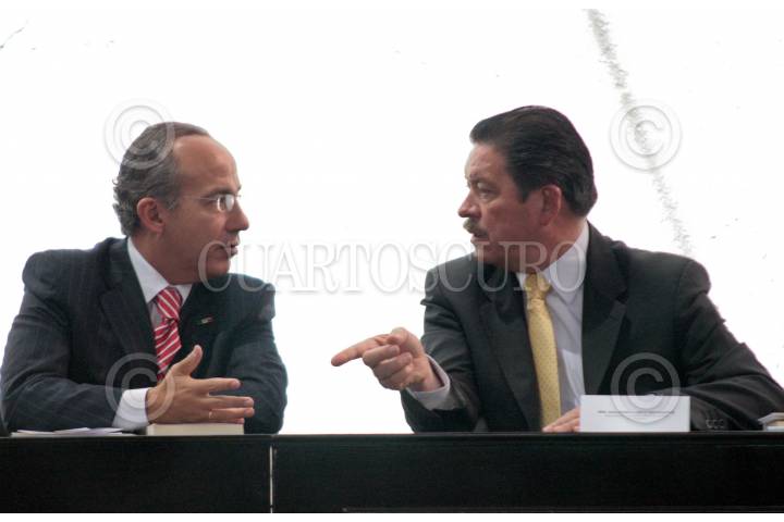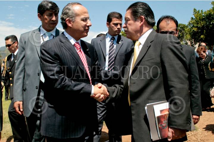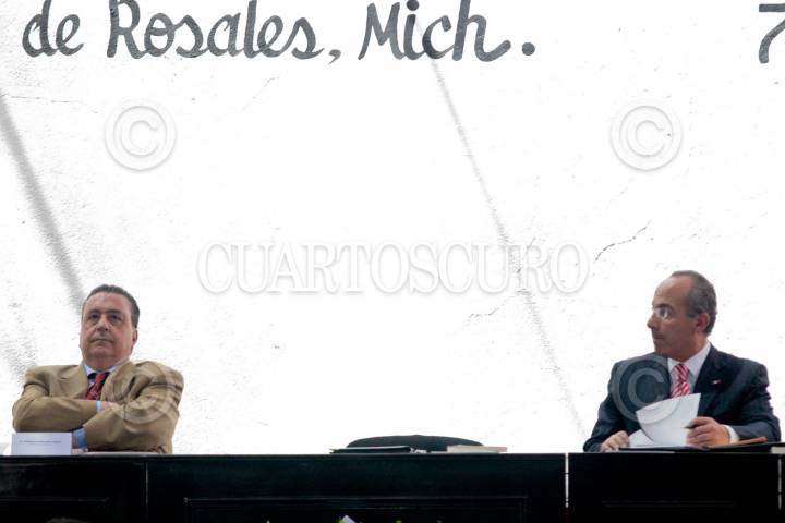 ARIO DE ROSALES, MICHOACAN, 07MARZO2010.- El presidente Felipe Calderón conversa con Carlos Navarrete, presidente de la mesa directiva del Senado de la República durante la ceremonia del CXCV aniversario de la instalación del Primer Tribunal Supremo para la América Mexicana. FOTO: CUARTOSCURO.COM