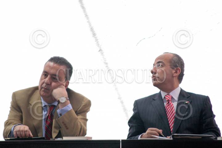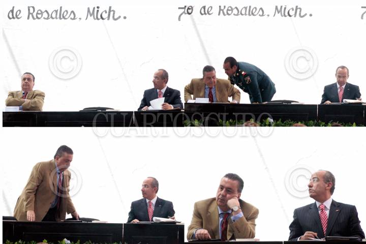 ARIO DE ROSALES, MICHOACAN, 07MARZO2010.- El secretario de gobernación Fernando Gomez Mont no ocupo el lugar del gobernador Leonel Godoy, personal de apoyo lo invitó a sentarse junto al presidente Calderón; durante el evento hubo un escaso dialogo entre los funcionarios federales. FOTO: IVAN MENDEZ/CUARTOSCURO.COM