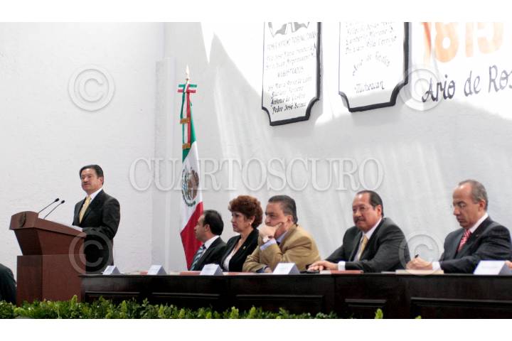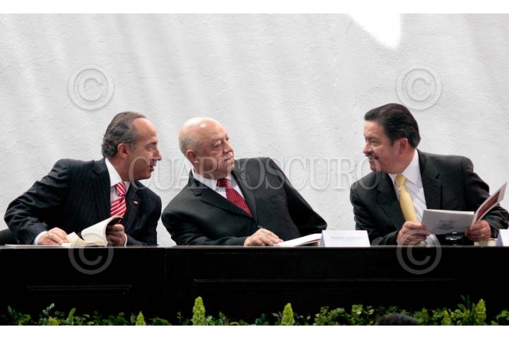 ARIO DE ROSALES, MICHOACAN, 07MARZO2010.- El presidente Felipe Calderón conversa con Guillermo Ortiz Mayagoitia, presidente de la Suprema Corte de Justicia de la Nación y con Carlos Navarrete, presidente de la mesa directiva del Senado de la República durante la ceremonia del CXCV aniversario de la instalación del Primer Tribunal Supremo para la América Mexicana. FOTO: CUARTOSCURO.COM