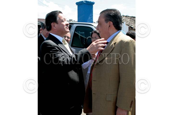 ARIO DE ROSALES, MICHOACAN, 07MARZO2010.- Carlos Navarrete, presidente de la mesa directiva del Senado conversa con Fernando Gomez Mont secretario de Gobernación al termino de la ceremonia del CXCV aniversario de la instalación del Primer Tribunal Supremo para la América Mexicana. FOTO: CUARTOSCURO.COM