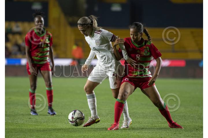 Stephane Mayor del Tri Femenil, se disputa el balón con Canarsie Amy de la selección de Surinam, en el estadio Universitario. Marcador Final 9 - 0 a favor de las mexicanas.