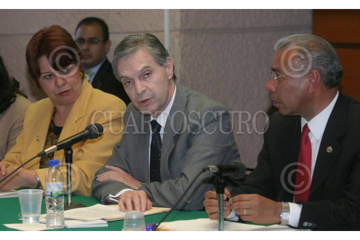 MEXICO, D.F., 16ENERO2006.- Susan Stephenson, senadora del PAN, Luis Ernesto Derbez, Secretario de Relaciones Exteriores y Sadot Sánchez, senador del PRI, durante la reunión de trabajo con diputados federales, en la cual se discutió la postura que tedrá que adoptar el gobierno ante las politicas migratorias de EE.UU. FOTO: Moisés Pablo/CUARTOSCURO.COM