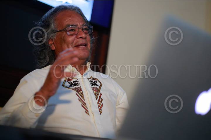 Pedro Valtierra durante la presentación del libro "La mirada crítica del fotoperiodista Pedro Valtierra" así como el último número de la revista Cuartoscuro, en el Centro Queretano de la Imagen.