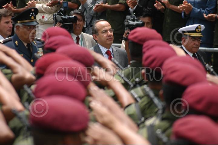 MÉXICO D.F. 23JULIO2007.-El presidente Felipe Calderón Hinojosa, acompañado de Agustin Cartens Secretarío de Hacianda y Credito Público, Guillermo Galvan Galvan Secretarío de la Defensa Nacional y de Francisco Syanez Mendoza Secretarío de Marina, durante la ceremonia de la Entrega de Creditos Hipotecarios para la fuerzas armadas que se realizó en el Campo Militar No. 1A. FOTO: GUILLERMO PEREA/CUARTOSCURO.COM