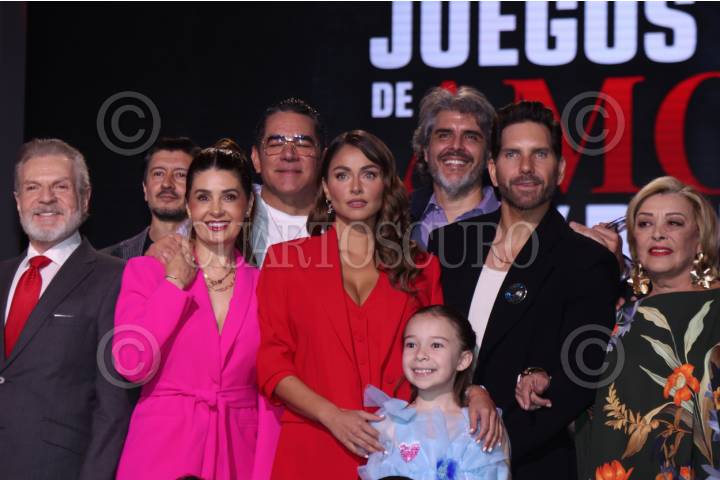 CIUDAD DE MÉXICO, 27MARZO2025. Alejandro Tommasi, Mayrín Villanueva, Eduardo Santamarina, Claudia Martín, Carlos Bardasano, Arap Bethke y Sylvia Pasquel durante la presentación de la telenovela “Juegos de amor y poder”, producción original de Televisa Univision, en Televisa San Ángel. FOTO: EDGAR NEGRETE LIRA/CUARTOSCURO.COM