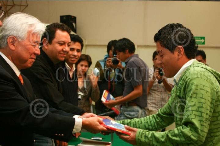 MÉXICO D.F., 28AGOSTO2008.- El secretario de educación pública del Distrito federal Axel Dridiksson entrega a un alumno de nivel medio superior el libro de sexualidad "Tu Futuro en libertad" ,durante la distribución de este a los alumnos del instituto de educación media superior Ricardo Flores Magon. FOTO: SÁSHENKA GUTIÉRREZ/CUARTOSCURO.COM