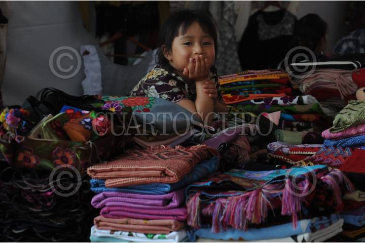 CIUDAD DE MÉXICO, 14SEPTIEMBRE2023. - Una niña se encuentra sentada en medio de los rebozos que vende su familia en el bazar "Tapame con tu Rebozo". FOTO: DANIEL AUGUSTO /CUARTOSCURO.COM