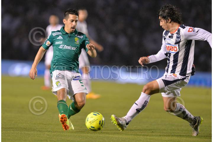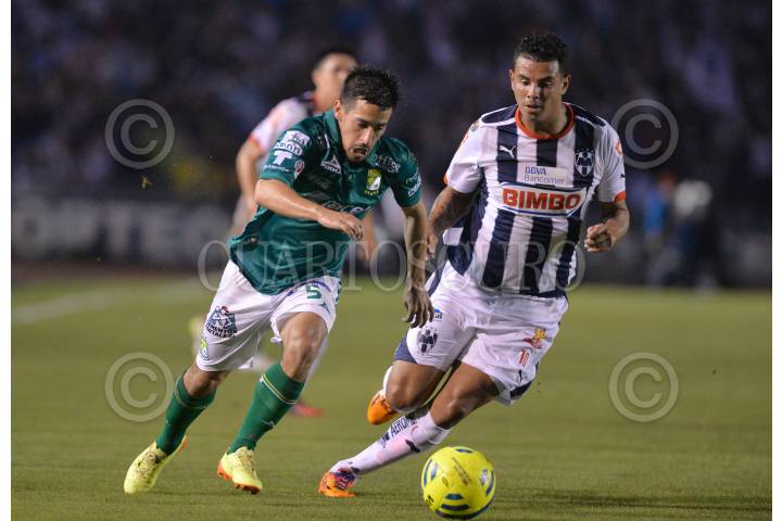 MONTERREY, NUEVO LEÓN, 21MARZO2015.- Estefan Medina equipo de los Rayados del Monterrey, se disputa el balón con Fernando Navarro del equipo de los Esmeraldas del León, en el estadio Tecnológico, partido correspondiente a la jornada 11 de la Liga MX FOTO: CUARTOSCURO.COM