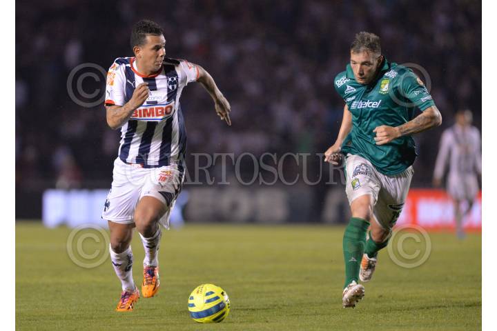 MONTERREY, NUEVO LEÓN, 21MARZO2015.- Edwin Cardona del equipo de los Rayados del Monterrey, se disputa el balón con Fernando Navarro del equipo de los Esmeraldas del León, en el estadio Tecnológico, partido correspondiente a la jornada 11 de la Liga MX. FOTO: CUARTOSCURO.COM