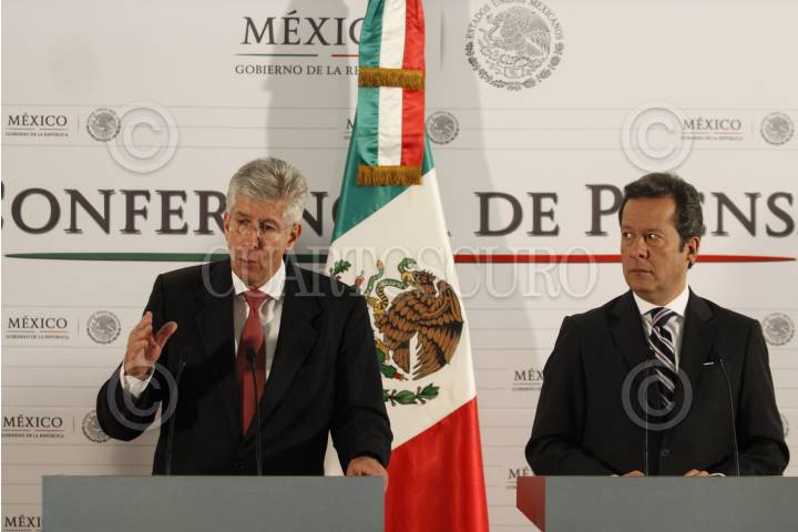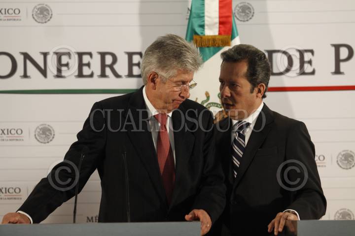 MÉXICO, D.F., 09JULIO2014.- Gerardo Ruíz Esparza, secretario de Comunicaciones y Transportes y Eduardo Sanchez, vocero de la Presidencia de la República durante una conferencia que ofrecieron a los medios de comunicación sobre el tema de telecomunicaciones que se realizó en el en el Club Naval Norte. FOTO: RODOLFO ANGULO /CUARTOSCURO.COM