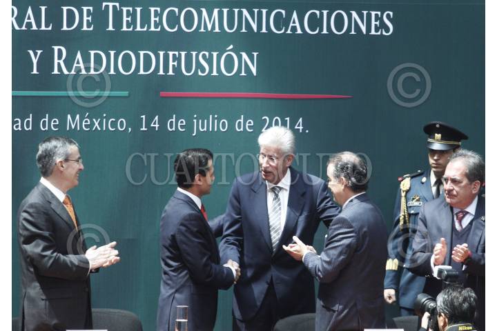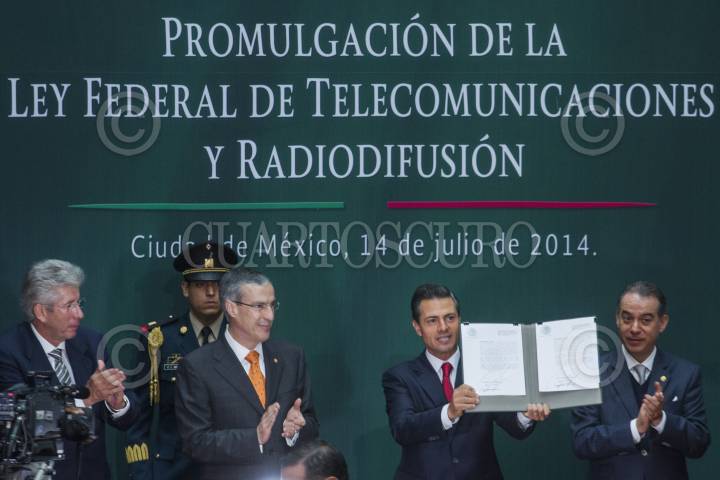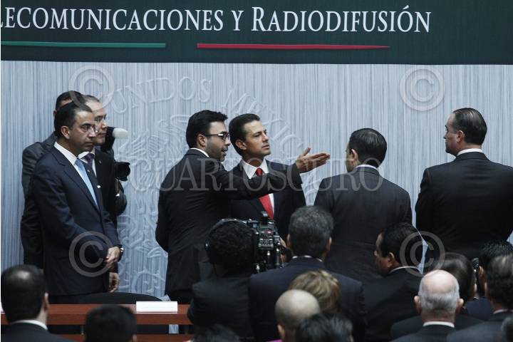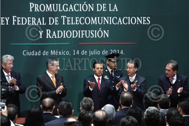 MÉXICO, D.F., 14JULIO2014.- Enrique Peña Nieto, presidente de la República, promulgó la Ley Federal de Telecomunicaciones y Radiodifusión en el Palacio Nacional. En la imagen, acompañan al mandatario Gerardo Ruiz Esparza, secretario de Comunicaciones y Transportes, así como los presidentes de las Cámara de Diputados, José González Morfin, Senado, Raúl Cervantes, y Carlos Lozano de la Torre, gobernador de Aguascalientes. FOTO: ISAAC ESQUIVEL /CUARTOSCURO.COM