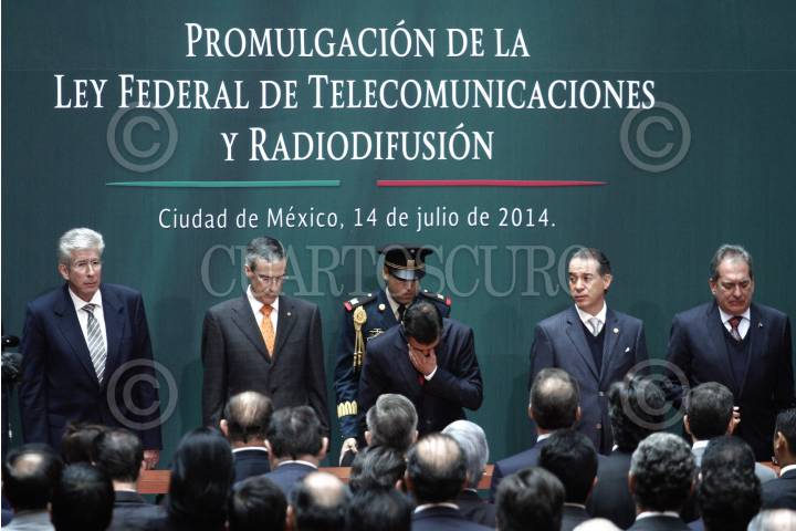 MÉXICO, D.F., 14JULIO2014.- Enrique Peña Nieto, presidente de la República, promulgó la Ley Federal de Telecomunicaciones y Radiodifusión en el Palacio Nacional. En la imagen, acompañan al mandatario, los legisladores Javier Lozano y Héctor Humberto Gutiérrez Garza, así como el titular del Ifetel, Gabriel Contreras. FOTO: ISAAC ESQUIVEL /CUARTOSCURO.COM
